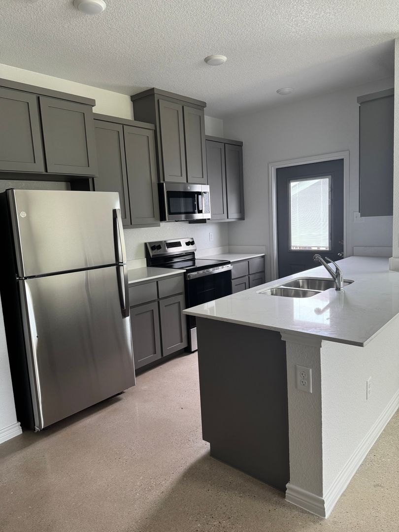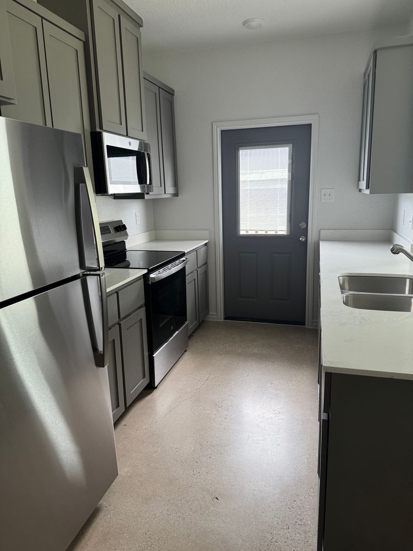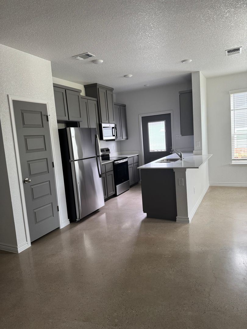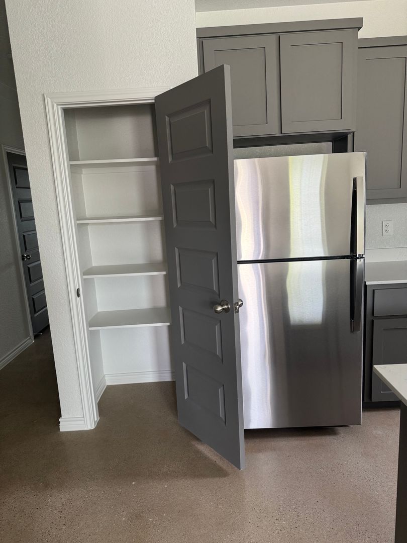 Open Kitchen with quartz countertops, pantry, and stainless steel appliances